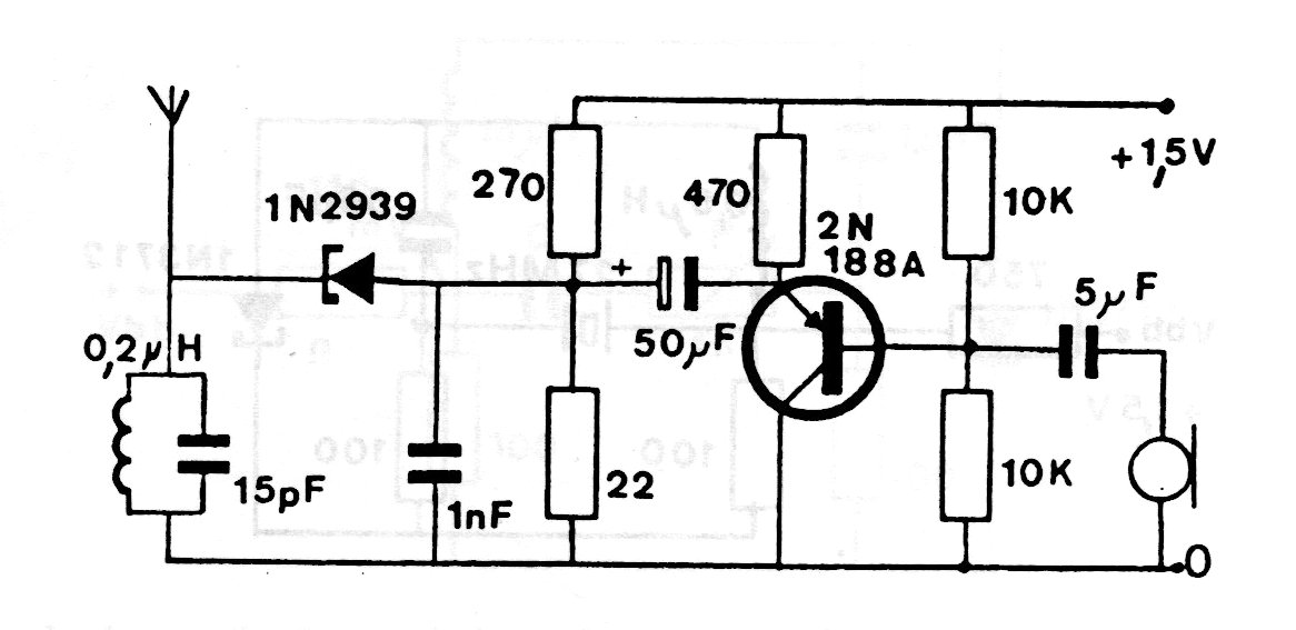 Este transmisor de corto alcance funciona con sólo una pila y la bobina consta de 4 espiras de hilo 28 en forma de 0,5 cm sin núcleo. Los capacitores deben ser cerámicos. El diodo de túnel no es un componente fácil de obtener.