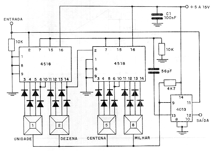 La frecuencia de los pulsos aplicados a la entrada de este circuito CMOS se dividirá por el número programado por las llaves digitales de 1 a 9999. El circuito tiene una velocidad máxima de división de 6 MHz con una alimentación de 10 V. Se pueden agregar más contadores en cascada, una división por valores mayores. La alimentación se puede hacer con tensiones de 5 a 15 V y el consumo es muy bajo.