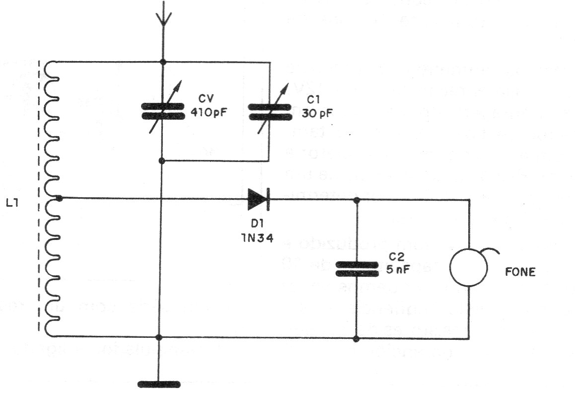 Este receptor de ondas medias tiene una configuración elemental como una radio de galena. La bobina consiste en 100 espiras de hilo 28 en forma de 2 a 2,5 cm sin núcleo con toma en la 30ª espira. La antena debe ser larga y la conexión es la tierra es importante. La variable es común de radio de onda media. El auricular debe ser de cristal o piezoeléctrico.