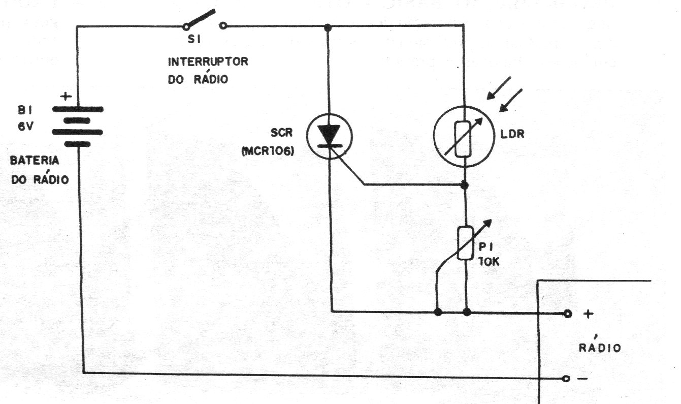 Con este circuito es posible conectar una radio transistorizada con el flash de una linterna o un láser pointer. Sin embargo, se debe considerar que existe una caída de tensión del orden de 2 V cuando el SCR conduce. Una tensión un poco mayor que la que la radio requiere sería conveniente para garantizar su correcto funcionamiento. Para apagar se debe utilizar S1.