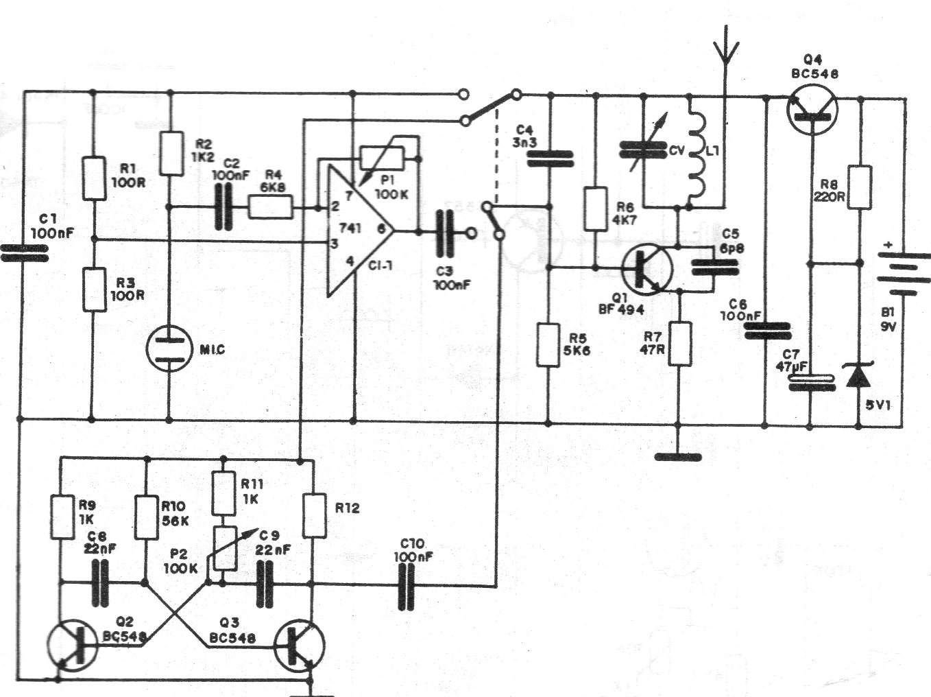 Este circuito reúne en un solo montaje un micrófono inalámbrico y un generador de barras para TV analógica en VHF. Las barras se ajustan en 2 mientras que P1 ajusta la ganancia del micrófono de electreto. La bobina tiene 4 espiras de hilo 28 o 26 en forma de 1 cm sin núcleo y la antena debe tener un máximo de 15 cm para mayor estabilidad. CV es un trimmer común de hasta 30 pF de capacitancia máxima.
