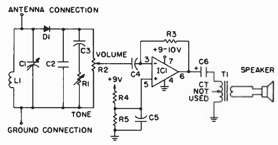 Este receptor de cristal con circuito integrado 741 fue encontrado en una revista de 1979. El circuito integrado es el 741 y el transformador de salida encontrado en radios antiguos. La bobina consta de 100 espiras de hilo esmaltado 28 en un bastón de ferrita y la variable es común para el rango de ondas medias. C2 es de 10 nF, C3, C4 y C5 de 100 nF, C6 de 100 uF. El diodo es 1N34 y R2 de 25k o 22 k. R1 es un potenciómetro de 22k o 47k. R3 tiene 1 M ohms y R4, R5 son resistores de 4k7.