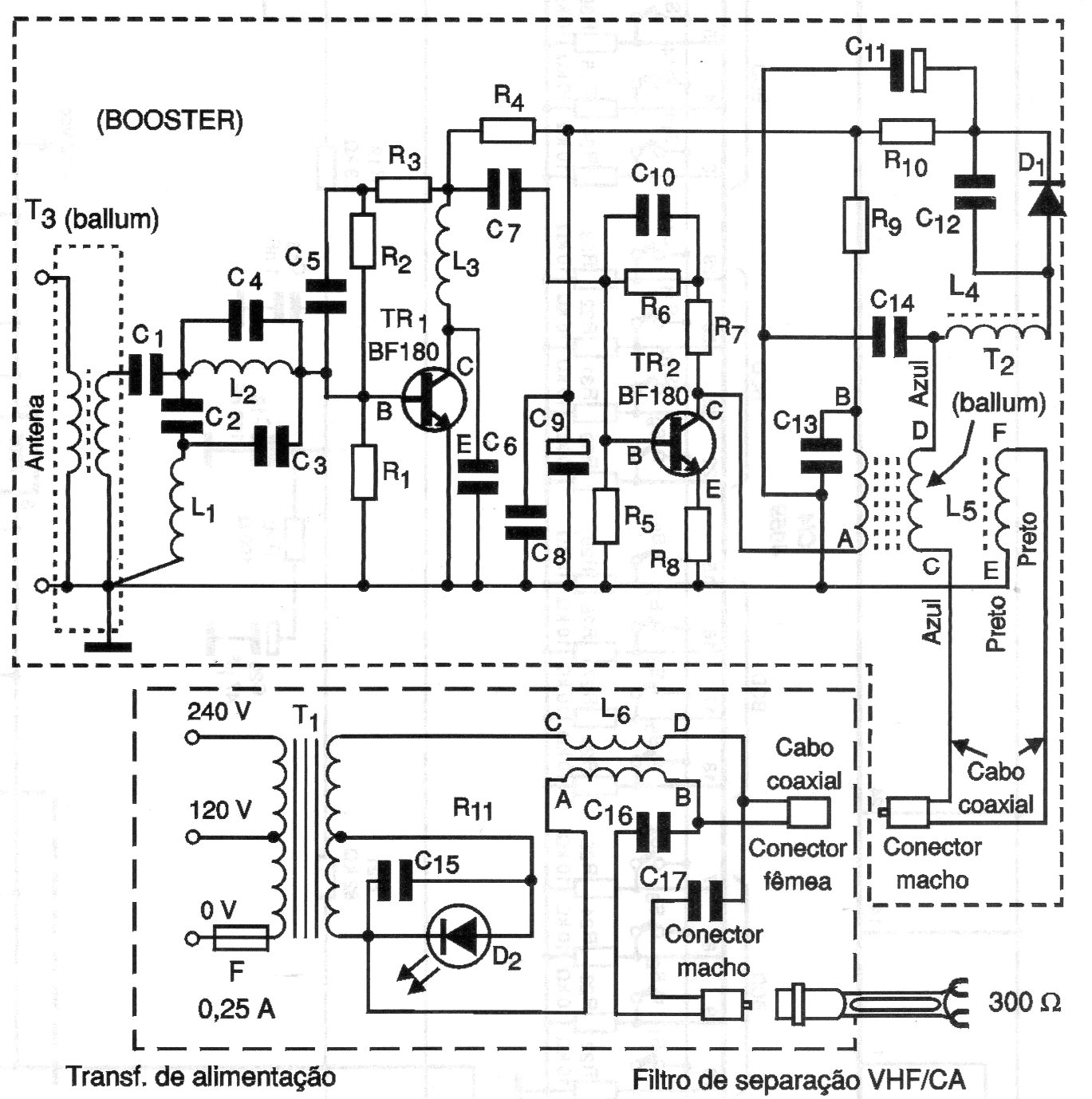 Este circuito es de una publicación de 2001. Los transformadores tipo balun son del tipo comercial para TV y las bobinas consta de 10 espiras de hilo 28 en bastón de ferrita. El circuito tiene una fuente que alimenta el circuito por el propio cable, ya que debe quedar junto a la antena.