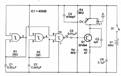 Este transmisor emite bips que se pueden captar en un receptor de FM a una distancia de hasta algunos cientos de metros. Para el rango de FM L1 consta de 4 espiras de hilo 22 o 24 en forma de 1 cm sin núcleo y CV es un trimmer de aproximadamente 2 -20 pF. Los condensadores deben ser cerámicos y la antena debe tener de 15 cm a 40 cm largo. El circuito es del libro Fun Projects for the Experimenter de Newton C. Braga.