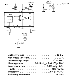 Este circuito de alto rendimiento se encontró en el manual de circuitos integrados lineales de la SGS de 1982. El transistor de potencia admite el equivalente y la corriente máxima de salida es de 3 A. El circuito se puede utilizar como regulador conmutado en una fuente fija de 12 V x 3 bis.