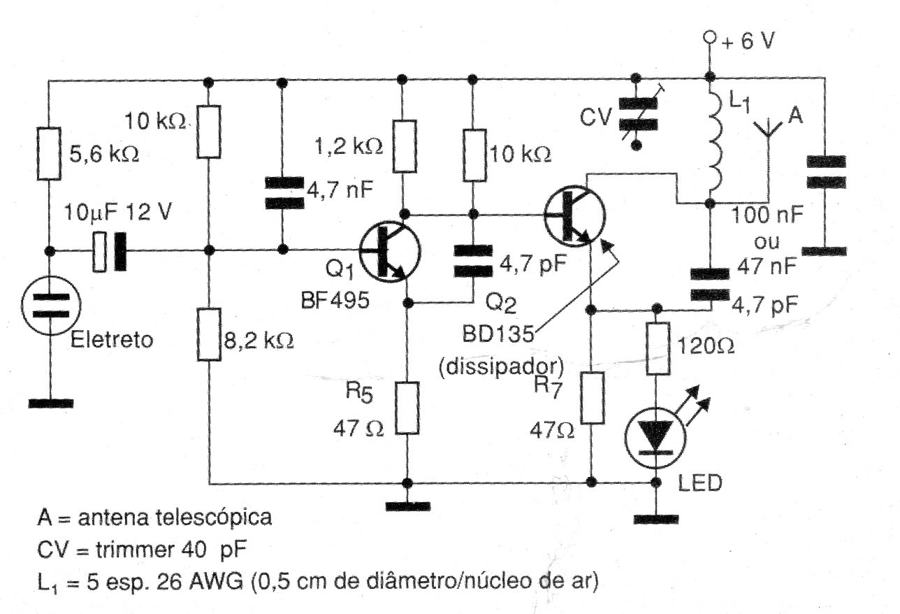 El transmisor que presentamos, encontrado en una documentación de 2003, opera alrededor de 88 MHz y tiene un alcance del orden de 400 metros. El transistor BD135 debe montarse en un radiador de calor y la modulación se consigue a partir de un micrófono de electreto. La bobina L1 consta de 5 espiras de hilo 26 AWG en forma de 0,5 cm de diámetro sin núcleo. CV es un trimmer común de hasta 40 pF donde se ajusta la frecuencia de operación del transmisor. La antena puede ser de tipo telescópico con una longitud de 30 a 100 cm. Una aplicación sugerida para este pequeño transmisor es como emisora comunitaria.