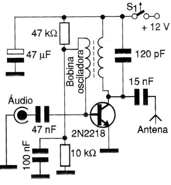 Este pequeño transmisor experimental de AM tiene un alcance de algunos metros y puede ser alimentado por tensiones de 6 a 12 V. La bobina está formada por un enrollamiento de 80 espiras de hilo 28 en el colector de Q1 y 40 espiras del mismo hilo sobre el mismo hilo núcleo de ferrita de 1 cm de diámetro.