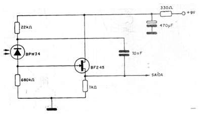 Este circuito está destinado a la recepción de señales ópticas moduladas en enlace directo o fibra óptica. El circuito tiene como sensor un foto-diodo que admite equivalente y el circuito puede ser alterado con el cambio del resistor de 680 k, obteniéndose característica de acuerdo con la señal recibida. Este resistor puede tener valores entre 470 k y 1 M.