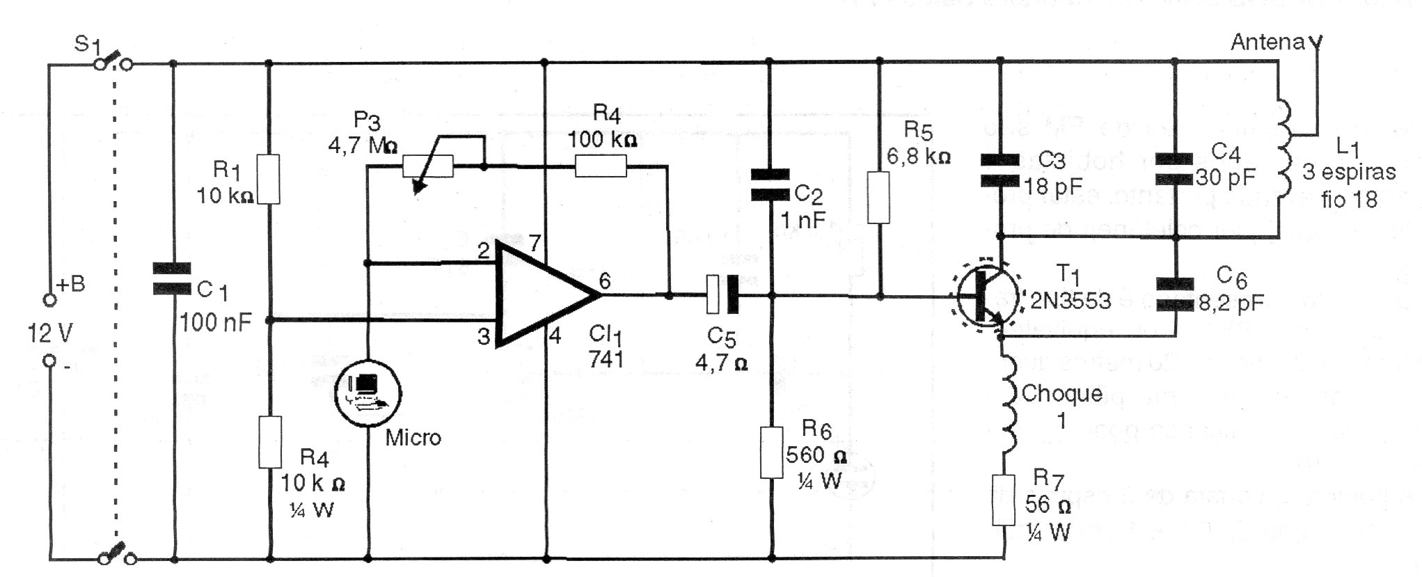 Este transmisor de FM se ha encontrado en una revista de 1997, pero aún puede montarse con facilidad.fio 18 en forma de 1 cm sin núcleo y la antena está conectada a la toma central. El circuito debe ser alimentado por batería o buena fuente con al menos 2 A y el transistor debe estar dotado de un disipador de calor. El choque XRF está formado por 200 espiras de hilo 32 en un resistor de 100 k x ½ W.