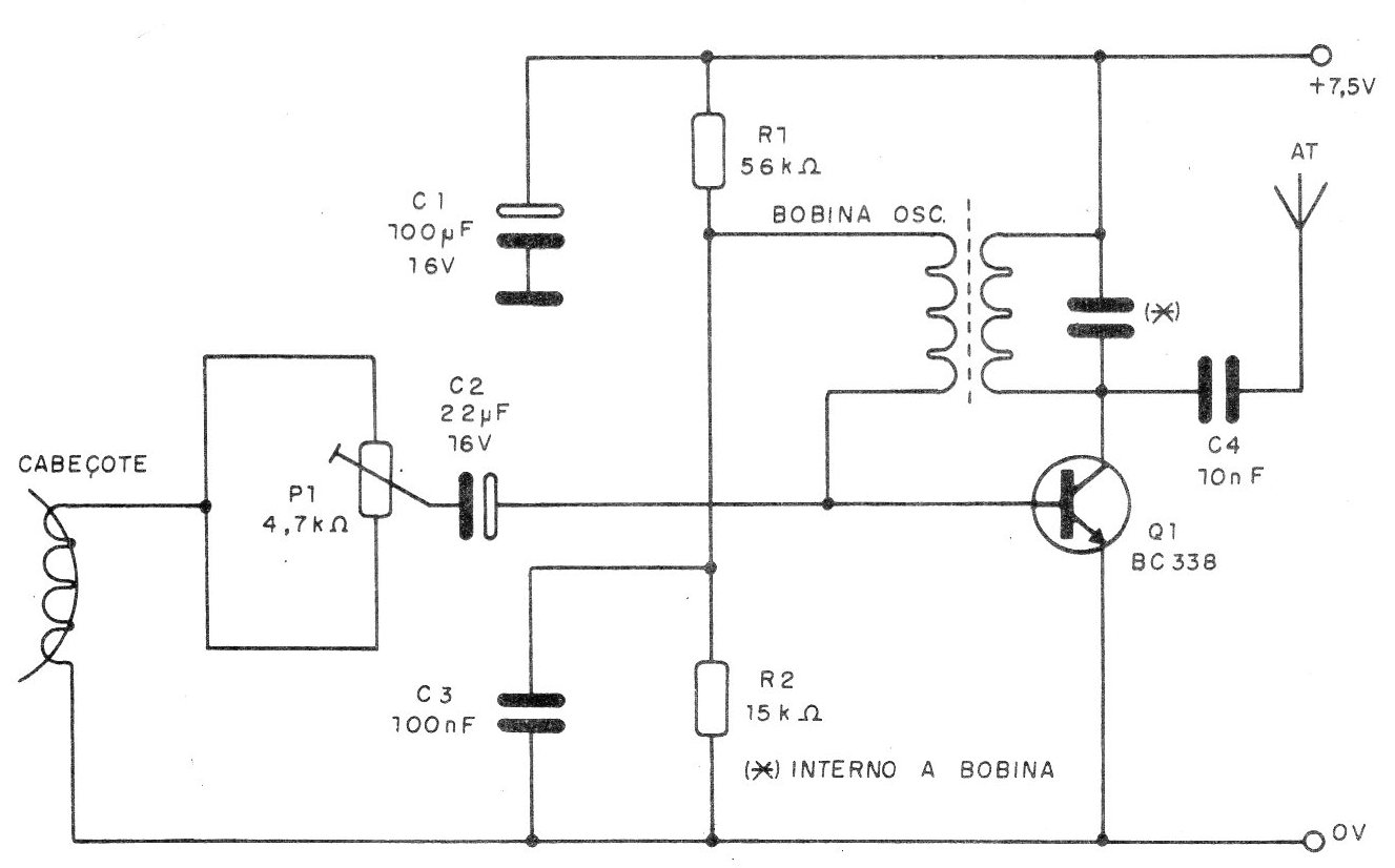 Este transmisor se obtuvo en una publicación de 1993. Transmite las señales de una cubierta de grabadora a un receptor colocado cerca. La frecuencia obtenida de una bobina osciladora de radio AM está alrededor de 800 kHz y P1 ajusta la modulación. La alimentación, en realidad, puede ser hecha por tensiones de 6 a 9 V. El alcance es de unos metros.