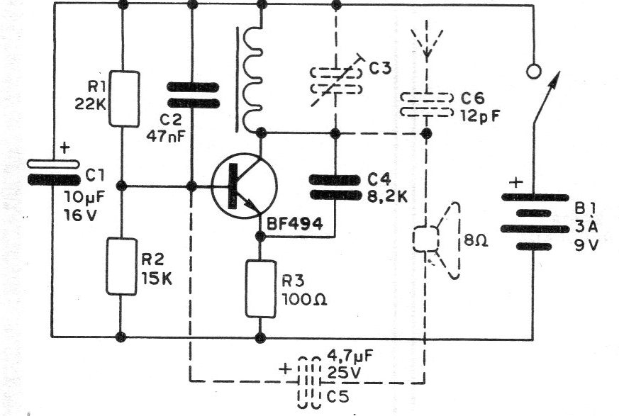 Este pequeño transmisor, encontrado en una publicación de 1982, envía sus señales a un receptor de FM colocado cerca, de un televisor analógico sintonizado en el canal 6. El ajuste de frecuencia exacta se realiza en un trimmer. El circuito completo se muestra en la figura. El micrófono utilizado en este aparato es en realidad un pequeño altavoz de 8 ohmios que está conectado al circuito de un modo diferente, obtenido experimentalmente por el autor. El ajuste de frecuencia se realiza en C3 que es un trimmer común. La antena usada debe tener de 10 a 30 cm de longitud. El autor montó este aparato teniendo como base el proyecto de un generador de señales, alterando su bobina que consiste en 4 espiras de hilo 28 o 26 AWG, en una forma de 1 cm de diámetro con núcleo de ferrita. La alimentación se realiza con tensiones entre 3 y 9 V procedentes de pilas o batería común. Los capacitores, con excepción de C5, son cerámicos. El capacitor C5 es electrolítico con valor obtenido experimentalmente, según el micrófono.