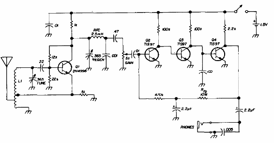 Este circuito, que recibe señales de las bandas de 40 y 80 metros entre 4 y 15 MHz, fue encontrado en una publicación para radioaficionados de 1973. El transistor Q1 puede ser el BF494 o 2N2222 y los demás BC548. El receptor tiene escucha en auriculares piezoeléctricos o de cristal. La bobina tiene 30 espiras de hilo 28 en forma de 1 cm con toma en la 8ª espiras desde el lado de tierra.