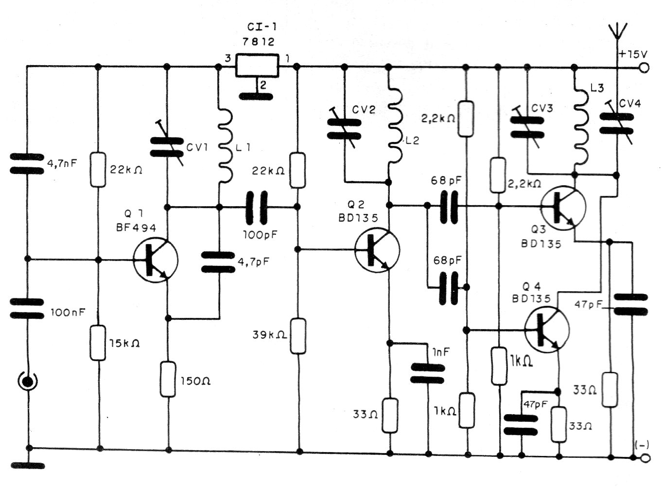Este potente transmisor de FM fue encontrado en una documentación de 1992. El circuito requiere una fuente de 12 V con excelente filtrado. L1, L2 y L3 tienen 3, 4 y 5 espiras de hilo 18 en forma de 1 cm de diámetro. Los trimmers son comunes de 3-30 pF o más grandes. Los capacitores deben ser cerámicos de excelente calidad.