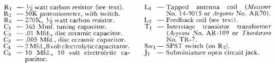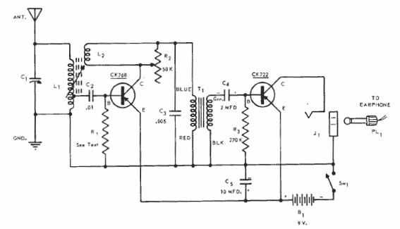 Esta radio de ondas medias con transistores de germanio es de una publicación de Raytheon de 1957. Los transistores equivalentes modernos pueden ser experimentados y el auricular debe ser de alta impedancia. L1 tiene 30 + 70 espiras de hilo 28 y L2 10 espiras del mismo hilo en el mismo palo. La antena debe ser larga.