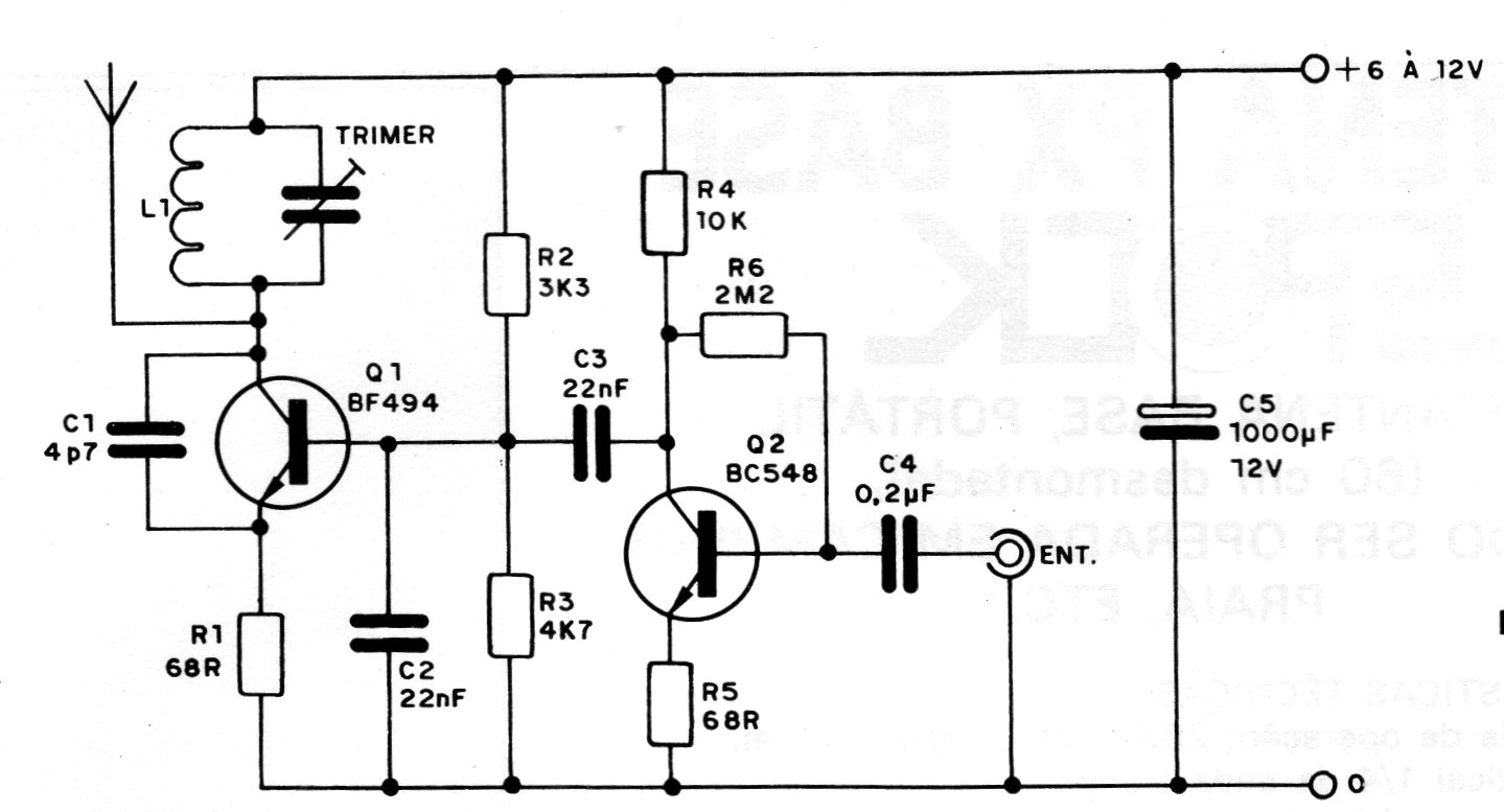Este circuito se obtuvo en una documentación de 1981. Se trata de un transmisor de FM que puede servir para emitir el sonido de un micrófono, un tocadiscos, una grabadora, etc., funcionando como una pequeña estación de juguete de uso doméstico. El circuito como podemos observar, es bastante simple siendo formado por dos etapas: la primera consiste en un oscilador de RF cuya frecuencia es determinada por el circuito resonante L - Cv. La bobina consiste en 4 espiras de hilo 18 a 24 con un diámetro de 1 cm. El condensador ajustable permite encontrar una frecuencia de operación en la que no haya ninguna emisora. El transistor utilizado en este paso puede ser de cualquier tipo para RF como, por ejemplo, el BF494 o el PD1001. La segunda etapa consiste en el modulador, el cual utiliza un solo transistor NPN de silicio para uso general. Este transistor originalmente es del tipo BC548, pero equivalentes como el BC547, BC237 o BC238 pueden ser usados, sin problemas. El resistor de emisor de este paso, de 68R puede eventualmente ser eliminado en la alimentación de 6 V del circuito. La alimentación se puede hacer con tensiones entre 6 y 12 V y el alcance del circuito dependerá de ésta. La antena utilizada debe tener un máximo de 15 cm de longitud para que no se produzcan inestabilidades de funcionamiento. Los mejores resultados en la transmisión se obtienen con transductores de cristal o piezoeléctricos.