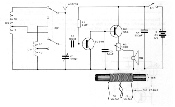 Este circuito en un receptor que permite la captura de estaciones distantes de ondas cortas. La modificación con respecto a un receptor de 1 banda consiste en añadir una llave de 2 polos x 2 posiciones y una bobina. Esta bobina se enrolla a la banda de onda corta con las siguientes características que se muestran en la figura: se enrollan 15 espiras de hilo 25 con toma en la quinta espira. Esta bobina se realiza en una forma de aproximadamente 1 cm de diámetro sin necesidad de núcleo de ferrita. En la conexión al circuito, desde la toma hasta la conexión al negativo común de la alimentación deben quedar las 5 espiras. Para buenos resultados se debe utilizar una antena larga.