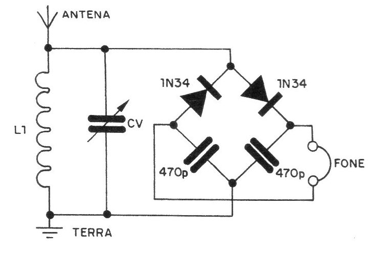 La utilización de un puente detector en lugar de un solo diodo, como se hace normalmente en las radios comunes de galena, permite aumentar la sensibilidad y, consecuentemente, el volumen del sonido obtenido en los auriculares. El circuito, muy simple, utiliza en el puente detector 2 diodos y 2 condensadores de 470 pF, además de las piezas comunes a los otros radios de este tipo. La bobina L1 debe tener 150 vueltas de alambre esmaltado 27 o 28, en una forma de 38 mm, o cerca de eso. El capacitor variable es del tipo común para ondas medias, y como antena se debe usar al menos 10 metros de hilo. El autor utilizó, con buenos resultados, una antena de 14 metros de largo. La conexión a tierra es muy importante para obtener una buena recepción. En la salida se debe utilizar un auricular magnético de alta impedancia (al menos 1 000 ohms), auriculares de cresta! o un transformador de salida con un auricular de baja impedancia o un parlante pequeño.
