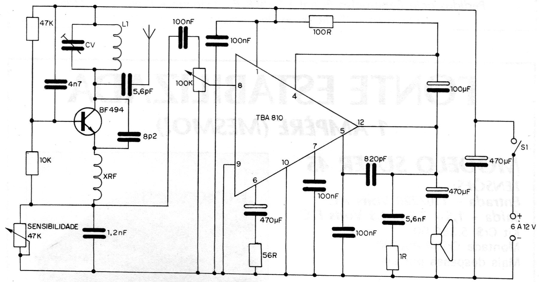 Un receptor de FM de buena sensibilidad y con una calidad de sonido aceptable en las estaciones más fuertes, puede montarse con pocos componentes. En la figura tenemos el circuito de un simple receptor de FM que usa sólo un transistor y un circuito integrado. El receptor consta, básicamente, de un detector súper regenerativo montado alrededor del transistor BF494, caracterizándose por su gran sensibilidad, y de un amplificador de audio integrado, que es el TBA810. L1 consta de 5 espiras de hilo 20 en una forma de 5 mm de diámetro sin núcleo, mientras que XRF se enrolla en un resistor de 100 k x ¼ W o en un palillo de madera de 2 ó 3 mm de diámetro. El número de espiras, en el caso, varía entre 40 y 50 y el hilo es 32 o más fino. La alimentación del circuito se realiza con tensiones entre 6 y 12 V. Para la antena se puede utilizar una varilla de metal de 40 a 80 cm. Los capacitores electrolíticos son de 12 V o más de tensión de trabajo, mientras que los demás pueden ser cerámicos o aún de poliéster. La sintonía se realiza en una variable pequeña para FM o, además, con la ayuda de un trimmer adaptado. Esta adaptación consiste en pegar en el tornillo de ajuste un pequeño eje, en el cual será fijado un botón de plástico. El altavoz, para una mejor calidad de sonido, debe tener al menos 10 cm de diámetro y su impedancia 8 ohms. En el montaje el lector debe mantener todas las conexiones bien cortas, principalmente en la parte de RF, para que no ocurran oscilaciones o realimentaciones que instabilicen su funcionamiento.