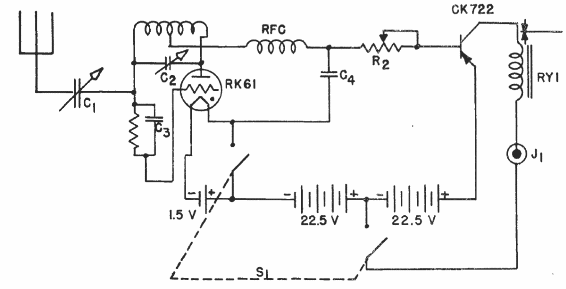 Este receptor de la década de 50 utiliza una válvula antigua en una configuración super-regenerativa y la alimentación es hecha por baterías que hoy en día son muy difíciles de obtener. La bobina determina la frecuencia. El circuito es de la década de los 60. Observe las baterías de alta tensión.