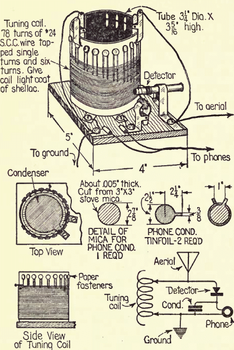 Los planes de construcción de este receptor de galena de 1922 fueron encontrados en una publicación de Hugo Gernsback. En la figura tenemos todos los detalles constructivos de la radio de ondas medias de la época. El auricular debe ser de alta impedancia (por encima de 2k) y la antena muy larga. El cristal de galena puede ser sustituido por un diodo 1N34 o equivalente.