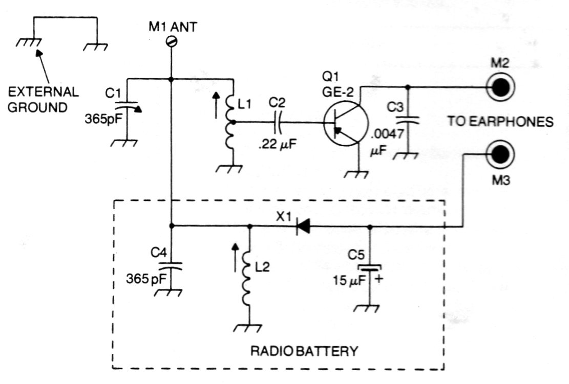 Este circuito, ya explorado en otras publicaciones, utiliza la señal de una estación fuerte para obtener la energía que alimenta el paso amplificador. Se debe dar preferencia a los transistores de germanio y el auricular debe ser de alta impedancia. Las bobinas son para la banda de ondas medias y la antena debe ser muy larga.