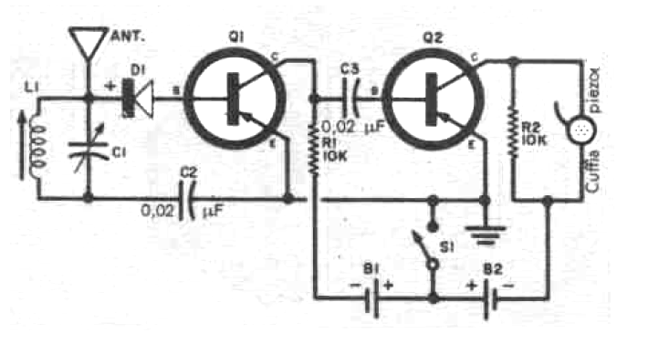 Este circuito utiliza originalmente transistores de germanio habiendo sido obtenido en una publicación de 1960. Sin embargo, el circuito puede ser elaborado con transistores de silicio y la alimentación hecha con dos conjuntos de 3 V (dos pilas). La antena depende de la intensidad de las señales y la bobina consiste en 100 espiras de hilo 28 en un bastón de ferrita. La variable puede obtenerse de una radio de onda media abandonada.