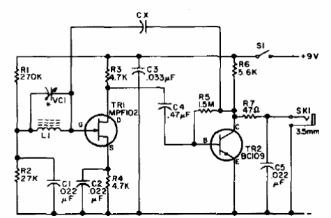 Este circuito experimental es de una publicación de 1975. La bobina consta de 80 espiras de hilo 28 en un bastón de ferrita y el capacitor variable puede ser obtenido en una radio AM fuera de uso. El FET puede ser el BF245 o MPF102 y el transistor NPN un BC548. La salida es para auricular o entrada de un buen amplificador. No hay necesidad de antena para la recepción de las estaciones locales.