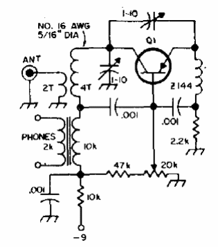 Este receptor recibe las señales del rango de VHF con escucha en auricular o con la aplicación en una etapa de potencia. El transistor puede ser el BF494 si se invertir la polaridad de la alimentación. El choque consiste en 50 espiras de hilo 32 en una forma de 0,5 cm sin núcleo y las bobinas de antena tienen 2 y 4 espiras de hilo 16 en forma de 1 cm sin núcleo. La variable se puede obtener de una radio FM fuera de uso, así como el transformador de salida.