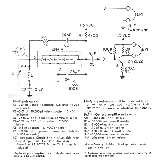 Este circuito fue indicado en un artículo de la revista americana Electronics Hobbyst del verano de 1974. La revista ya no existe, pero el proyecto se puede montar fácilmente, ya que los componentes son comunes excepto el circuito integrado Z414. Este circuito es muy difícil de obtener, pero si usted da suerte se puede utilizar en este proyecto. El ZN414 consiste en una radio AM integrada que puede funcionar con tensiones a partir de 1,2 V. El auricular debe ser de cristal o una cápsula piezoeléctrica. L1 puede ser enrollada consistentes en 80 espiras de hilo 28 a 32 AWG en un bastón de ferrita de 6 a 10 cm. C1 es un condensador variable sacado de una radio de ondas medias. El receptor no necesita antena, pero para las estaciones más débiles se conecta en A.