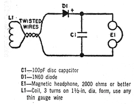 Este circuito fue indicado en el artículo de la revista americana Electronics Hobbyst del invierno de 1971. La revista ya no existe, pero el proyecto se puede montar fácilmente, ya que los componentes son comunes. El auricular puede ser de cristal o una cápsula piezoeléctrica. La bobina consiste en 3 vueltas de cualquier hilo en una forma de 3 a 4 cm sin núcleo que debe aproximarse a la bobina de salida del transmisor en prueba.