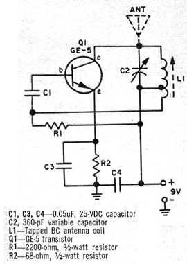 Este circuito fue indicado en el artículo de la revista americana Electronics Hobbyst del invierno de 1971. La revista ya no existe, pero el proyecto se puede montar con la utilización de un transistor BC548 o BF494. Para la banda de onda corta de 3 a 10 MHz enrolle 30 espiras de hilo 28 AWG en un bastón de herida de 10 a 15 cm de longitud con toma en la 10ª espira a partir del cuadro de tierra (R1). La antena puede ser telescópica y la alimentación tanto con 4 pilas como una batería de 9 V. C2 es una variable común tomada de una radio AM. Los capacitores deben ser cerámicos.