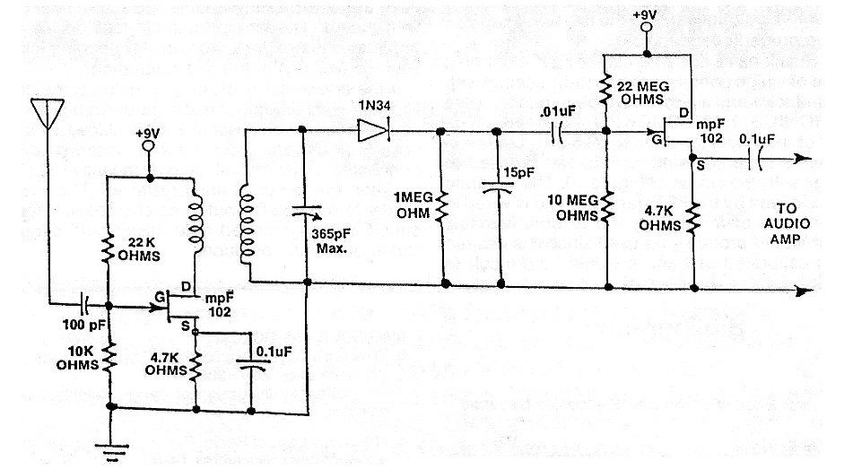 Este circuito salió en el Electronics Handobook Vol XIII de 1993, siendo una radio de galena o cristal con diodo 1N34 y dos etapas de amplificación con FET. Una de ellas es el amplificador de RF o de antena y la otra es el amplificador de audio. La salida del segundo paso se puede conectar a un amplificador de audio externo. La bobina tiene primario de 30 espiras de hilo 28 o 30 en un cable de escoba o tubo de PVC de 2,5 cm de diámetro. Su secundario, conectado a la variable consta de 100 espiras del mismo hilo. El primario debe ser enrollado sobre el secundario o al lado. La variable se puede obtener en una vieja radio de válvulas. El circuito tiene muy bajo consumo, pudiendo ser alimentado por una batería de 9 V. El MPF102 puede ser sustituido por el BF245.