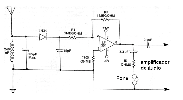 Este circuito fue adaptado de la publicación americana Electronics Handbook Volumen XIII de 1993. Sintoniza las estaciones de onda media permitiendo su escucha en un auricular o en un altavoz cuando se utiliza un amplificador externo. El amplificador operacional puede ser el 741 y la fuente debe ser simétrica. La bobina consta de 100 espiras de hilo 28 o 30 AWG en un cable de escoba o tubo de PVC de 1 pulgada. RF determina la ganancia del circuito que puede cambiar. La antena puede ser un pedazo de cable a partir de 2 metros y para las estaciones fuertes no hay necesidad de conexión a tierra.
