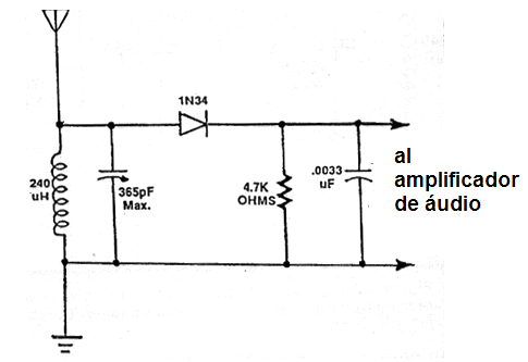 Este circuito, encontrado en Electronics Handbook, Volumen XIII de 1993 muestra un circuito simple de un sintonizador para las estaciones de AM. Las señales se aplican a la entrada de cualquier buen amplificador de audio. La bobina está formada por 100 espiras de hilo 28 o 30 AWG en un tubo de PVC de 1 pulgada o cable de escoba y la variable puede ser retirada de una radio AM valvulada fuera de uso. La antena debe ser larga (más de 5 metros) y la conexión a tierra es importante. Cualquier diodo de germanio puede ser utilizado en este circuito e incluso un cristal de galena.