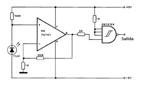 El circuito integrado SN72741 no es más que la versión de Texas Instruments del conocido 741. La alimentación de 5 V corresponde a lo exigido por la lógica TTL y como buffer tenemos el uso del 7413. La ganancia del circuito es dada por el resistor de 100k. La velocidad máxima de este circuito está alrededor de 100 kHz, pero se pueden probar amplificadores operativos más rápidos. El foto-diodo debe estar dotado de recursos ópticos de acuerdo con la aplicación. Observe la necesidad del uso de una fuente simétrica. El circuito se puede usar como shield de datos para microcontroladores.