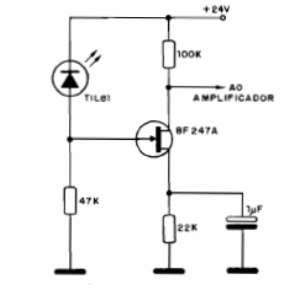 Este circuito se puede utilizar en un enlace de datos de baja velocidad o en la transmisión de sonido (modulación en amplitud). La señal puede ser tanto visible como infrarroja y el medio puede ser tanto el ambiente como una fibra óptica. El diodo sensor puede ser sustituido por equivalente. Los recursos ópticos apropiados se deben utilizar de acuerdo con la aplicación para obtener mayor rendimiento. El circuito se alimenta con 24 V, pero el consumo es extremadamente bajo. El cable al amplificador debe ser blindado y el FET admite como equivalente el BF245. Este circuito es sugerido por Texas Instruments.