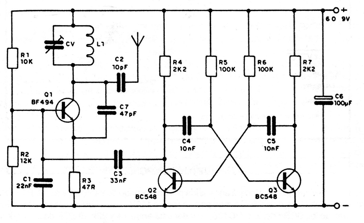 Este circuito modulado en tono opera entorno de 27M Hz. L1 consta de 7 espiras de alambre 24AWG, de 1 cm de diámetro sin núcleo. Cv es un trimmer común. La frecuencia de modulación es determinada por C4 y C5 que pueden ser conmutados en un sistema de diversos canales. EI alcance es del orden de los 50 m con una antena telescópica de 50 cm.