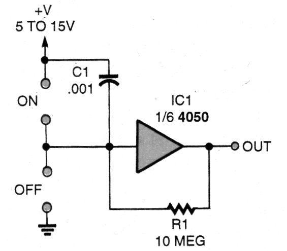 Este circuito utiliza uno de los 6 inversores CMOS de un 4060 como interruptor de desconexión de llamada. La fuente no debe ser sin transformador, y la alimentación depende de la aplicación.