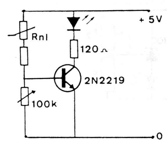 Este simple circuito controla el brillo de un LED a partir de LDRs, NTCs, PTCs u otros sensores resistivos. El potenciómetro de ajuste P1 puede tener valores entre 10k y 100k según la resistencia nominal del sensor, y el transistor puede ser el BC548. El resistor en serie con el LED determina su brillo. La tensión puede oscilar entre 6 y 12 V.