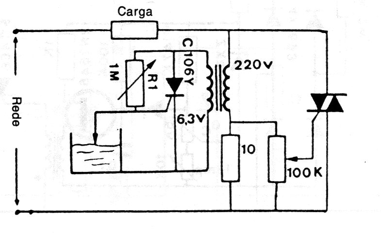 Este circuito hace uso de un triac para detectar el nivel de un depósito, y un SCR sensible conectado al sensor. El transformador proporciona aislamiento al circuito obteniéndose con mayor seguridad. El triac debe ser de acuerdo con la carga y el transformador es común. R1 ajusta la sensibilidad. El SCR puede ser el TIC106.