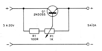 Las cargas de hasta 3 o 4 A se pueden controlar con este circuito. Se pueden utilizar transistores como el BD135 o TIP31 para el control de cargas de menor corriente. El transistor debe montarse en un buen radiador de calor. La tensión de entrada puede situarse entre 3 y 20 V. Para tensiones mayores se aumenta R1. P1 debe ser de hilo, en el caso del 2N3055.