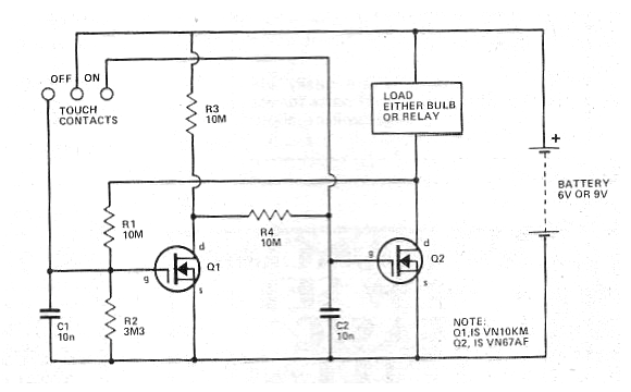 El circuito presentado consiste en un interruptor de tacto biestable hecho en torno a transistores de efecto de campo de potencia. Este circuito fue sugerido por la revista inglesa en una edición de 1981. Los transistores usados no son comunes, pero podemos usar en principio MOSFETs de potencias comunes equivalentes como los de la serie IRF. El circuito debe ser alimentado por pilas o batería y si se utiliza fuente debe ser del tipo con transformador. La carga tanto puede ser una lámpara incandescente como un relé. Los sensores son chapas que se deben tocar al mismo tiempo.