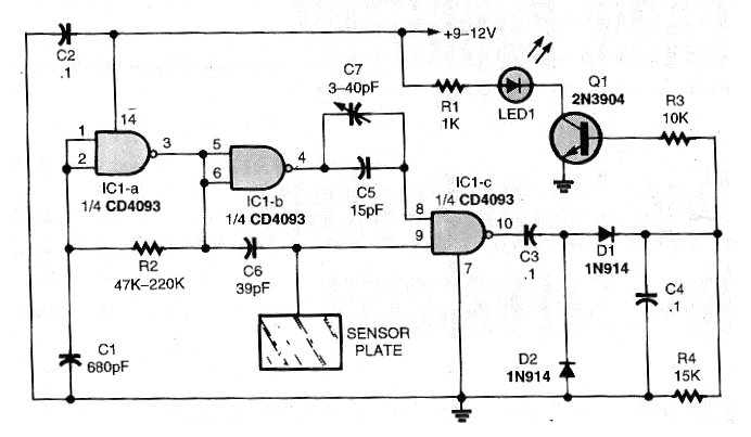 El circuito presentado salió originalmente en una revista Poptronics de 2001. Esta revista ya no existe, pero el circuito es totalmente viable. El transistor Q1, por ejemplo, puede ser cambiado por el BC548 y en su colector se puede conectar una etapa de potencia para accionar un relé o carga mayor. El circuito se basa en la amortiguación de un circuito oscilador por el toque en una placa sensora. La conexión a esta tarjeta debe ser corta. Los capacitores del circuito deben ser cerámicos y el punto de funcionamiento se ajusta en C7.