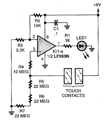 Este circuito fue sugerido en una edición del año 2000 de la revista Poptronics. La revista ya no existe, pero el circuito puede ser implementado con facilidad, pues los componentes todavía se pueden encontrar. El sensor consiste en dos planchas de metal que se deben tocar simultáneamente. En la salida (pin 1) podemos conectar una etapa de potencia para accionar una carga de mayor corriente. La sensibilidad es dada por los resistores de 22 M ohms, que eventualmente pueden tener el valor alterado. El circuito no debe ser alimentado por fuente sin transformador.
