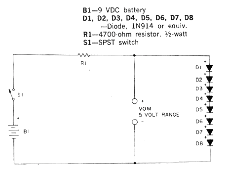 No sólo la corriente inversa (fuga) de un diodo varía con la temperatura, así como la caída de tensión en el sentido directo. Este circuito, sugerido por 101 Electronics Circuits de 1976, aprovecha esta característica de los diodos, en un termómetro que utiliza como indicador el multímetro en la escala de 5 VDC o cerca de ese valor, para indicar la temperatura. La tensión de alimentación puede oscilar entre 9 y 12 V. Diodos equivalentes a los indicados pueden utilizarse como los 1N4148.