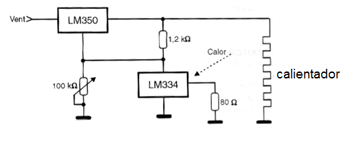 Con el circuito de la figura es posible controlar la cantidad de calor generada por el elemento de calentamiento. El elemento de calentamiento puede operar con tensiones de hasta 25 V y corriente máxima de 3 ampères. La tensión máxima de entrada de este circuito es de 35 V, y para un funcionamiento normal debe ser de al menos 2 V a más que la tensión requerida por el elemento de calentamiento. El sensor del circuito es un LM334 que debe colocarse junto al lugar donde está el calentador para detectar la temperatura de su ambiente. El circuito se puede utilizar en invernaderos, chocadores y experimentos de biología. El ajuste del circuito se realiza en el potenciómetro de 100 k ohms a la temperatura que se desea mantener.