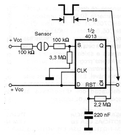 Este circuito dispara con el toque del sensor, pasando su salida del nivel alto al nivel bajo, por un tiempo dado por el capacitor de 220 nF y por el resistor de 2,2 M ohms. Podemos cambiar estos componentes en una amplia gama de valores según el tiempo de accionamiento deseado. La alimentación del circuito se puede realizar con tensiones entre 5 y 15 volts.