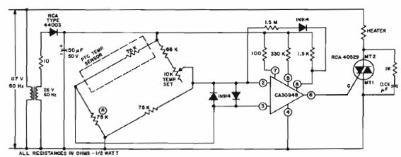 El circuito presentado apareció en un manual de circuitos integrados lineales de la RCA de 1972. Sin embargo, puede ser desarrollado a partir de componentes equivalentes más modernos como, por ejemplo, el amplificador y el triac que puede ser cualquiera de la serie TIC. El sensor consiste en un termistor cuyo valor en la temperatura desea determinar los valores de los demás componentes del puente.