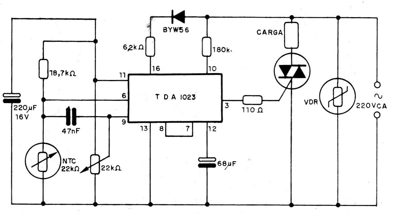 Si bien el circuito integrado TDA1023 no es más común en nuestro mercado, se puede utilizar en este interesante termostato de alta potencia con triac. El ajuste del disparo se realiza en el trimpot y la potencia controlada depende sólo del triac. El VDR sirve para proteger el circuito contra transitorios.