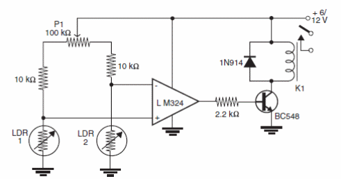 Este circuito detecta variaciones de luz utilizando dos LDR como sensores. Se pueden utilizar amplificadores operacionales y comparadores equivalentes. El punto de disparo se ajusta en el potenciómetro. El relé debe tener tensión de acuerdo con la alimentación. Este circuito es del libro Mechatronics, Robotics and Artificial Intelligence de Newton C. Braga, publicado en los Estados Unidos.
